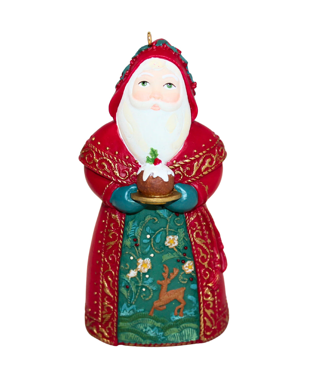 This ornament features Santa from England dressed in an ornate red robe with golden trim holding a sweet treat in his hands. It is ornately decorated in green on the inside with flowers and a brown reindeer.