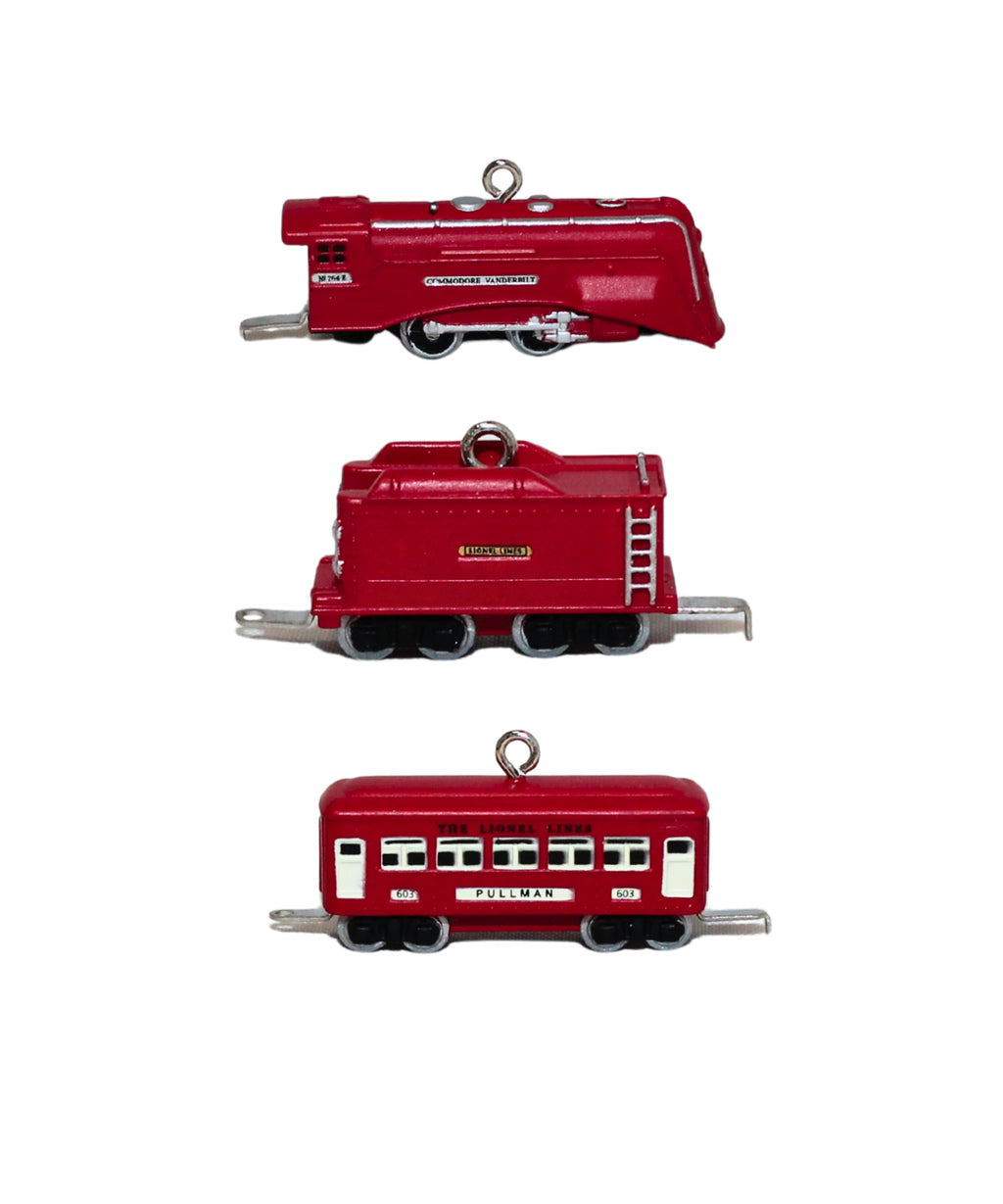 This set of three miniature ornaments feature the Red Comet locomotive, red tender, and red 603 Pullman car.