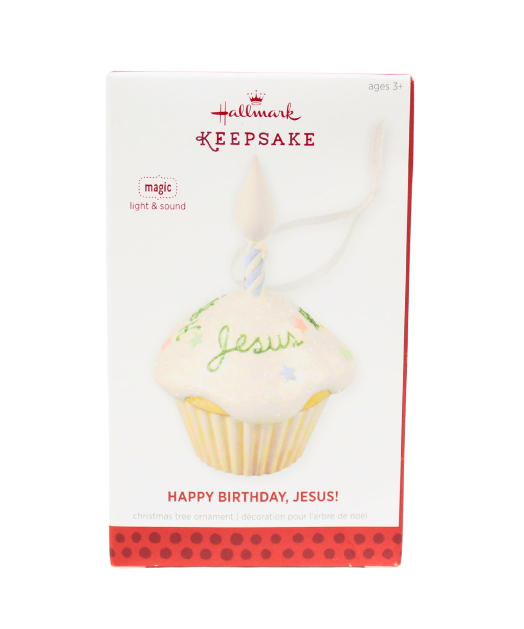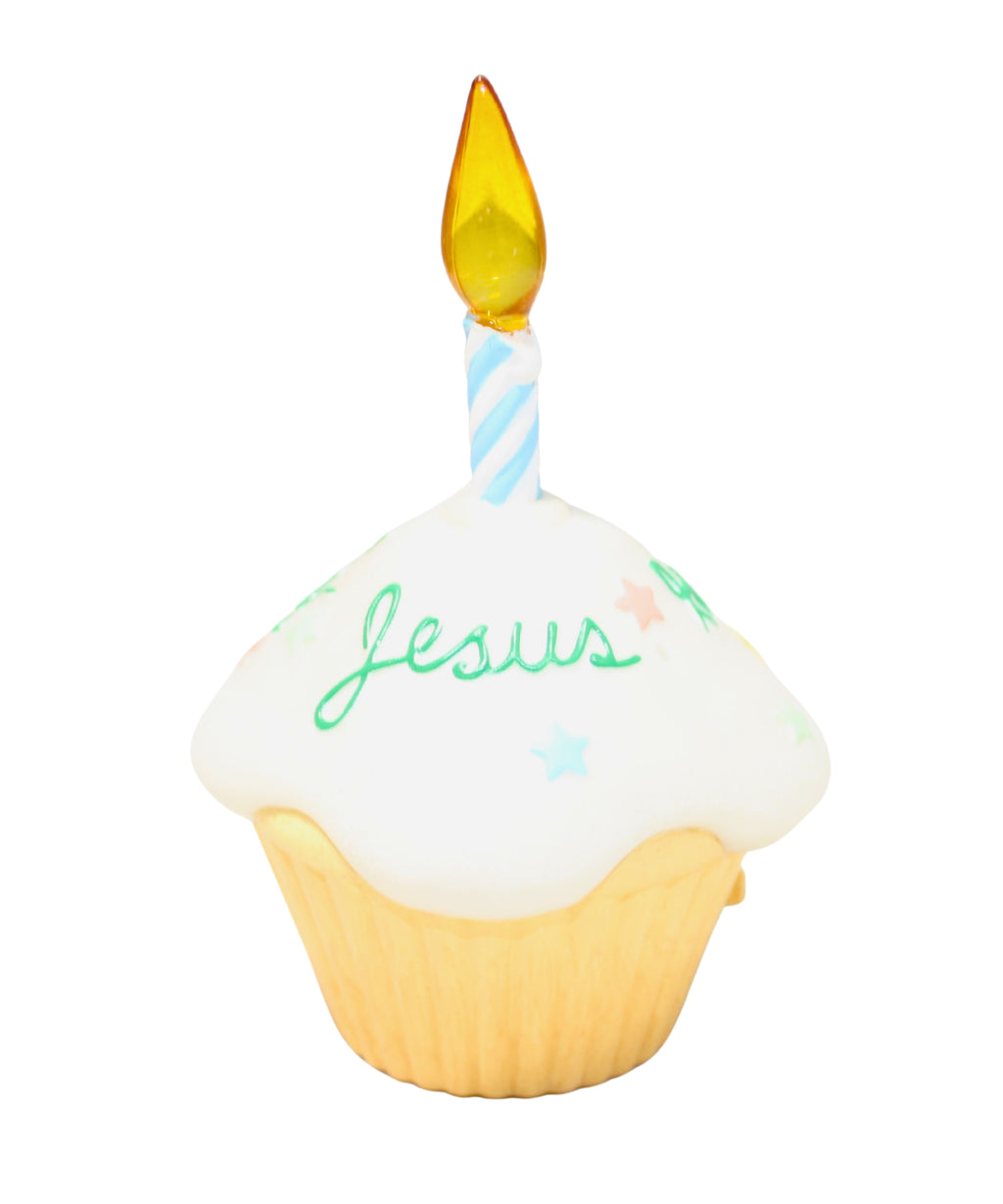 This ornament is a glittery white birthday cupcake with candle for baby Jesus decorated with stars and reads "Happy Birthday Jesus". Push the button to hear the song "Happy Birthday". Blow out the candle or it will fade after 15 seconds. Battery operated.