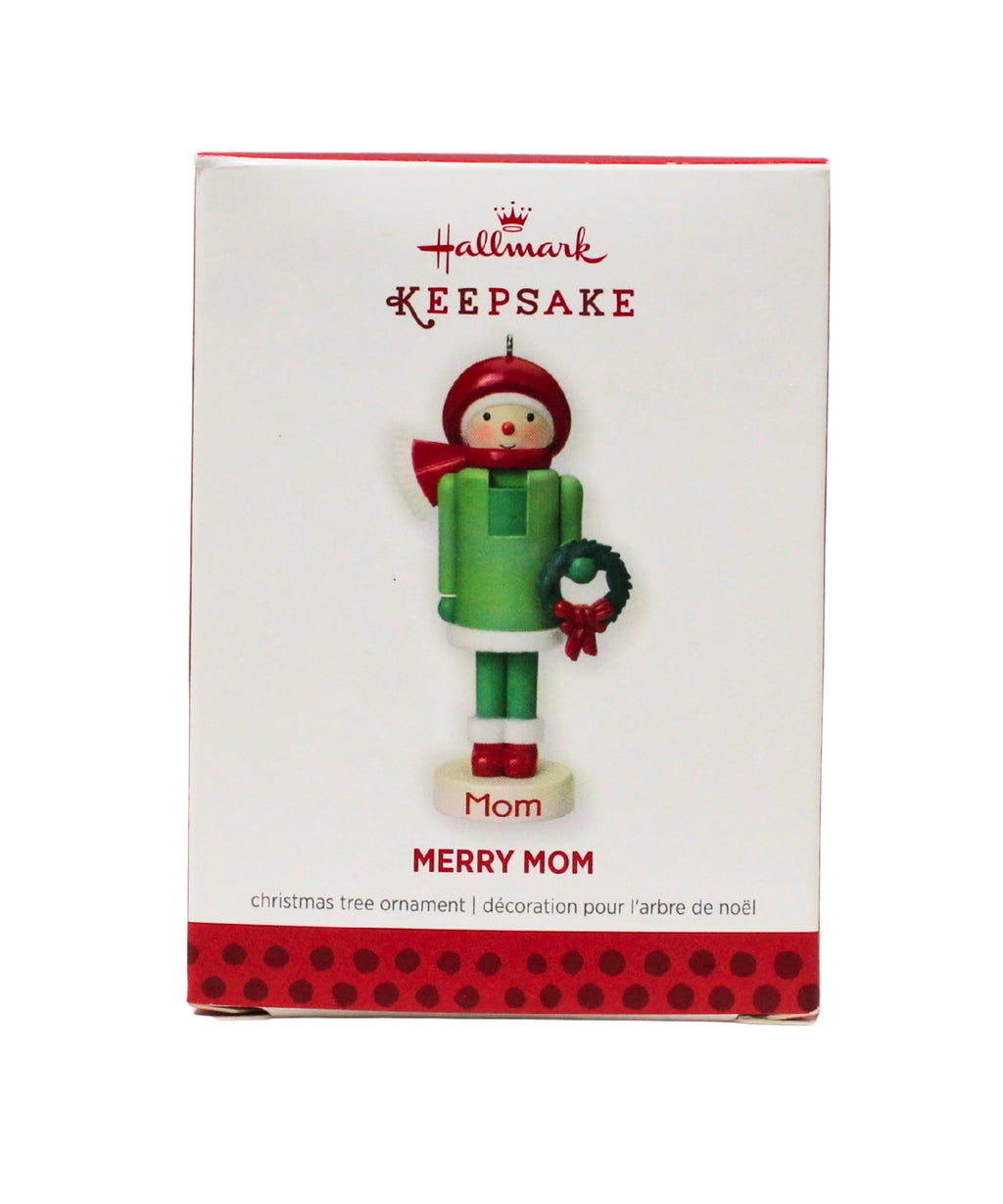 This ornament features a cheerful mom dressed in red hat and scarf in a green snow outfit holding a Christmas wreath, the front reads "Mom" and the back reads "2013".