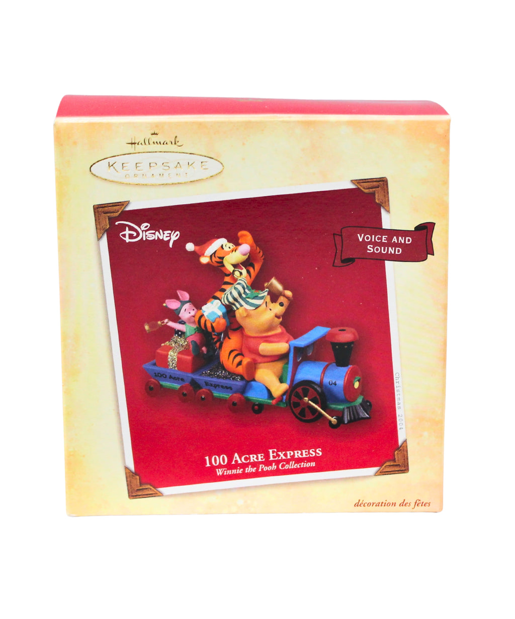 This battery operated voice and sound ornament features Winnie The Pooh as the conductor of the "100 Acre Express" with Tigger and Piglet riding along behind with the Christmas presents. Press the "headlight" button on the front of the train to hear different sounds.