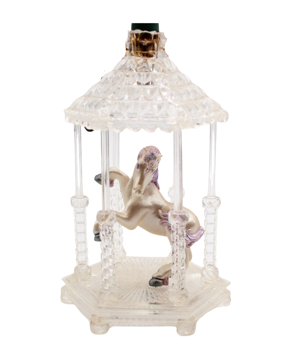 A pearly white unicorn silver hooves shines in this clear gazebo as the light shines down upon him. The magical spirit of this unicorn is clear in this ornament and make a beautiful addition to your Christmas tree. Attached this ornament to a miniature light strand to make the ornament glow.