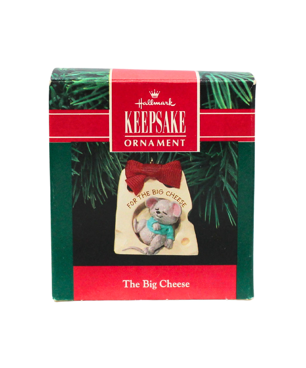 This ornament features a little mouse with a full tummy fast asleep in a block of cheese with a red bow on top that reads "For The Big Cheese" on the front, and "Merry Christmas 1991" on the back.
