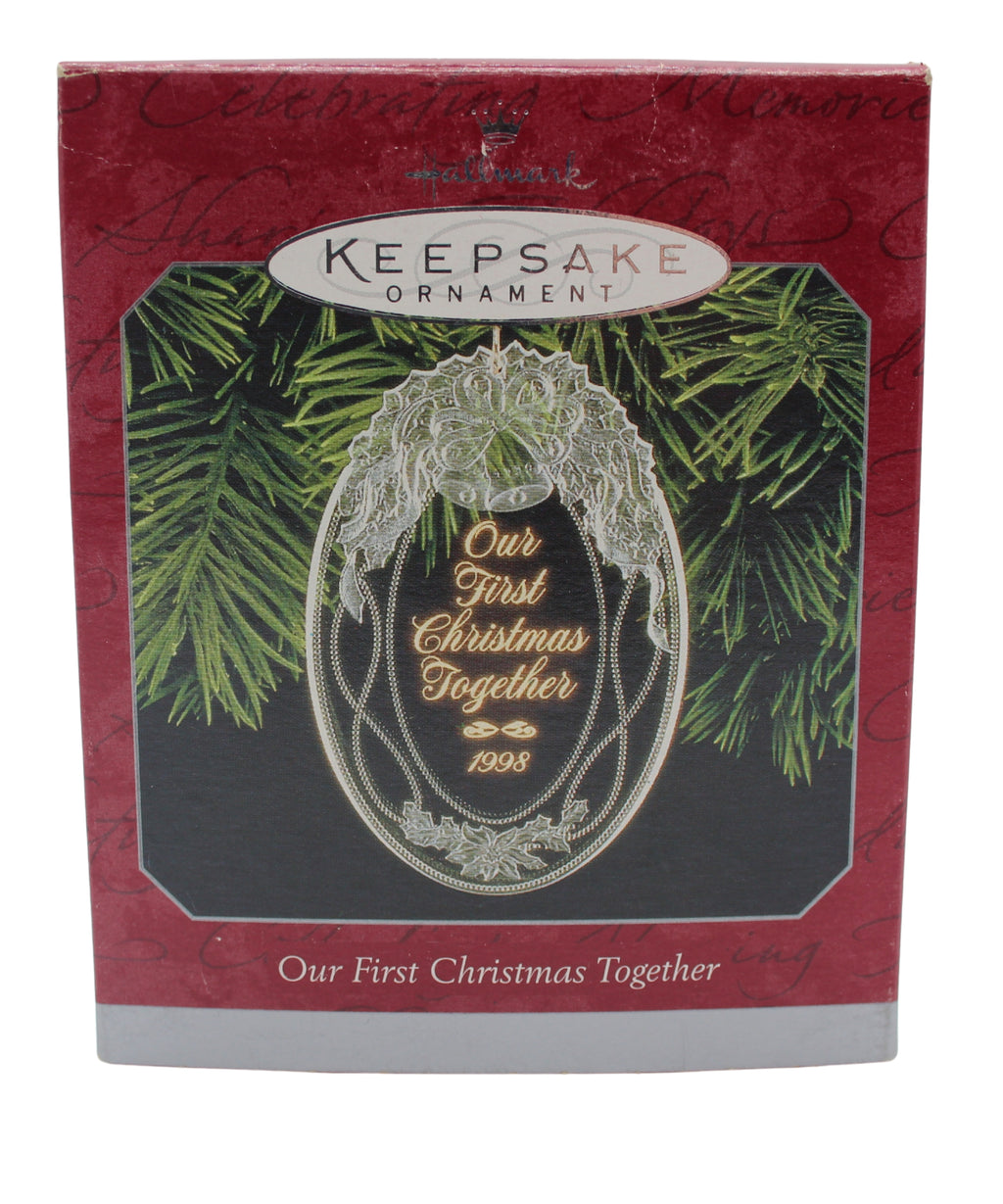 This acrylic ornament celebrates your first Christmas together and is dated 1998. The ornament is decorated at the top with two wedding bells and ribbon and has flowers at the bottom of the oval. The wording is in gold script.