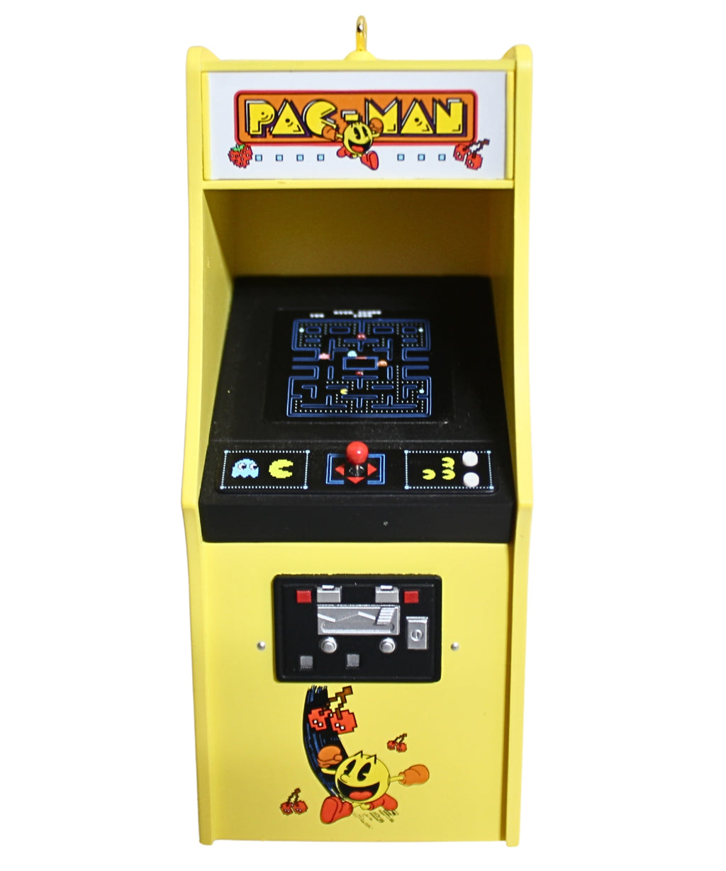 This ornament celebrates the old-school arcade version of Pac-Man, one of the best loved video games of all time. Pressing the "player" buttons on the front panel lights up the game and plays the unforgettable sounds of the timeless arcade classic!