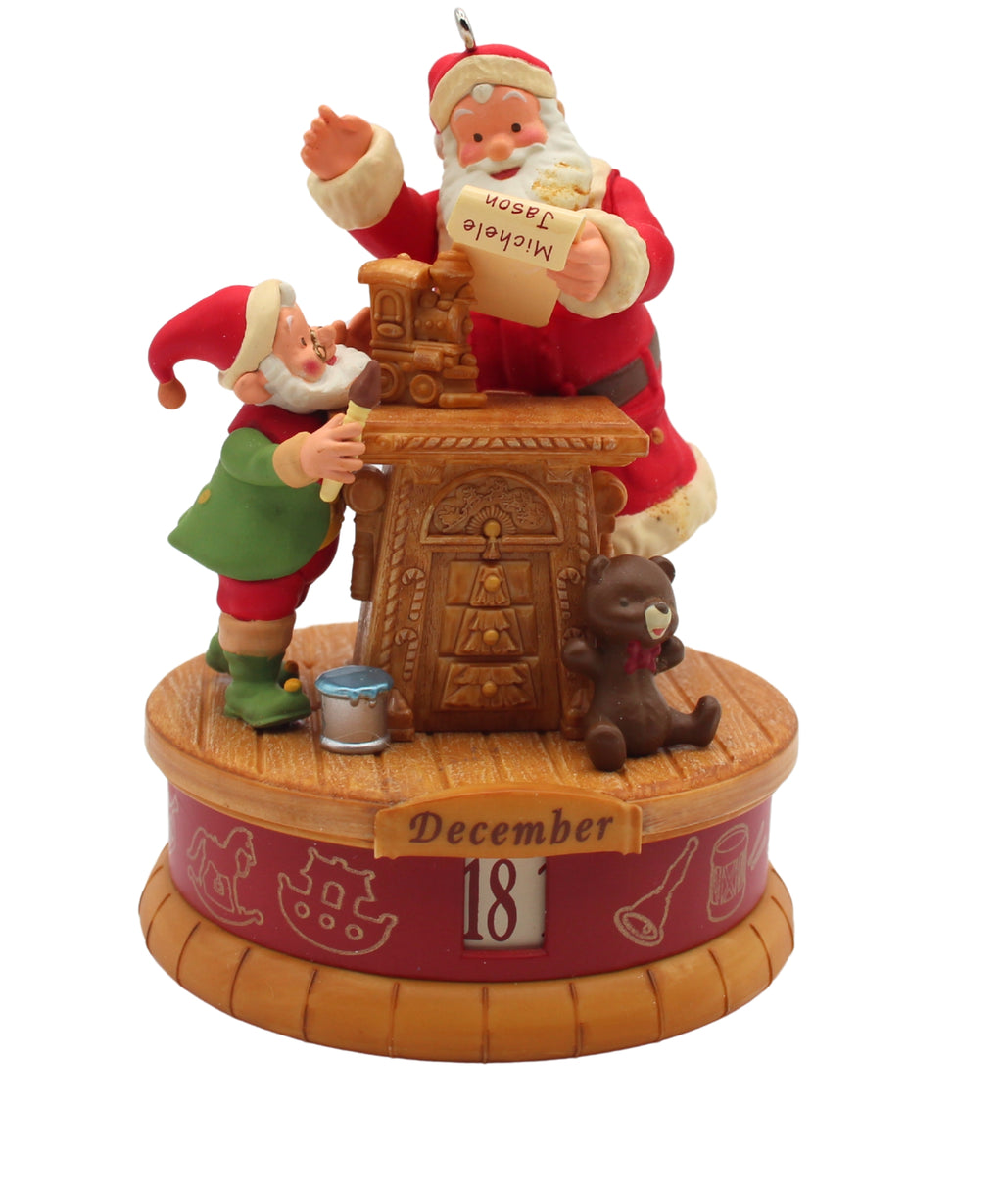 This is an advent calendar that starts on December 1st and counts down the things that need done before Christmas. Santa is checking his list with one of his elves. This ornament look similar to Once Upon A Christmas series.