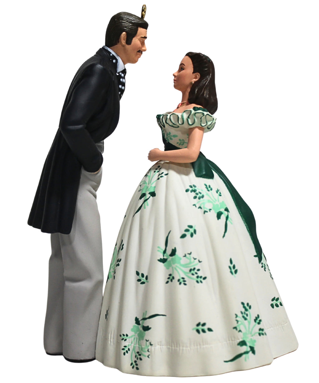 This ornament depicts a scene from the iconic classic movie, "Gone With the Wind," where Scarlett O'Hara and Rhett Butler bicker after he catches her proclaiming her love to a married man. Pressing the button on the ornament will play audio of the actual dialogue from this memorable scene!