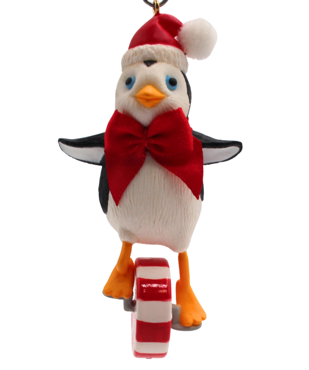 This little penguin may be the hit of the parade. He is riding a unicycle that has a wheel made out of a peppermint candy. It is red and white. The penguin has a Santa Claus hat and a red bow.