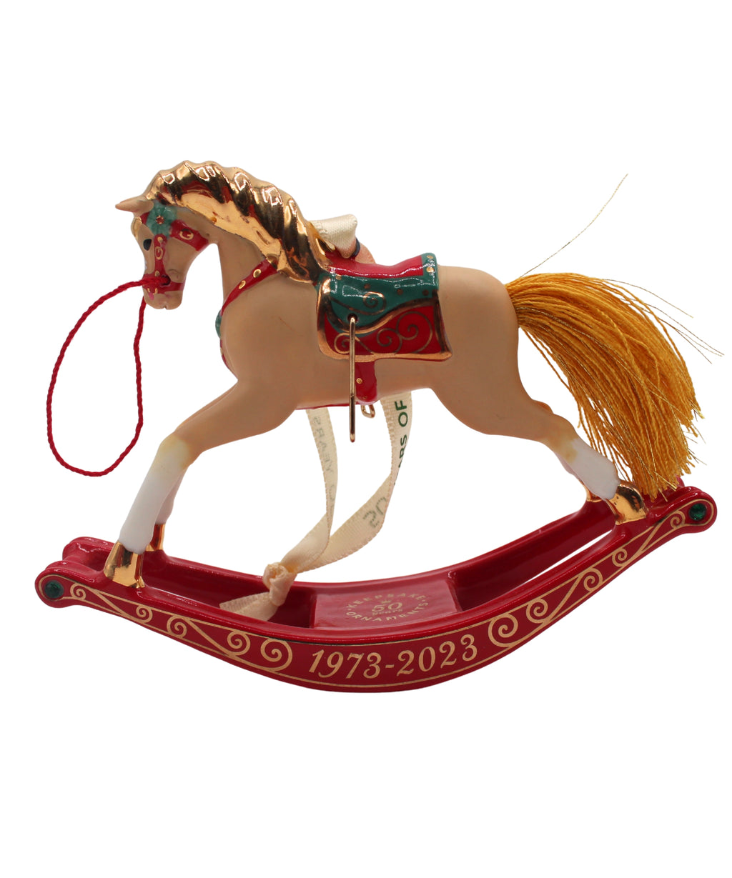 This 2023 50 Years of Memories - Rocking Horse - Special Edition ornament is the perfect addition to any tree. Celebrate fifty years of Hallmark Christmas ornaments with this festive rocking horse ornament. Crafted with love and attention to detail, this beautiful porcelain Christmastree ornament features a warm tan horse with a shiny gold mane, tail and hooves, festively accented with a red and green saddle and harness and gem accents. It also features a Year-dated 2023 so you can be sure that it's one of a kind! Add it to your collection today as it's sure to bea popular item amongst Hallmark collectors for its thoughtful design and nostalgic style. With its whimsical look, creative charm, and witty details, this Special Edition ornament is the perfect way to celebrate fifty years of memories!