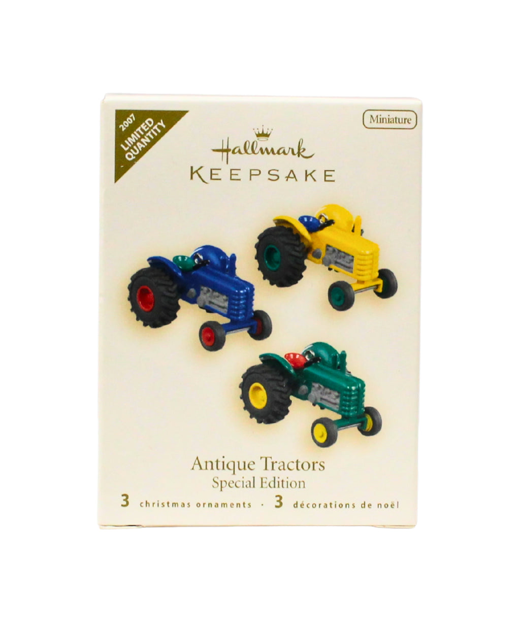 This set of three miniature ornaments feature yellow, green and blue antique tractors.