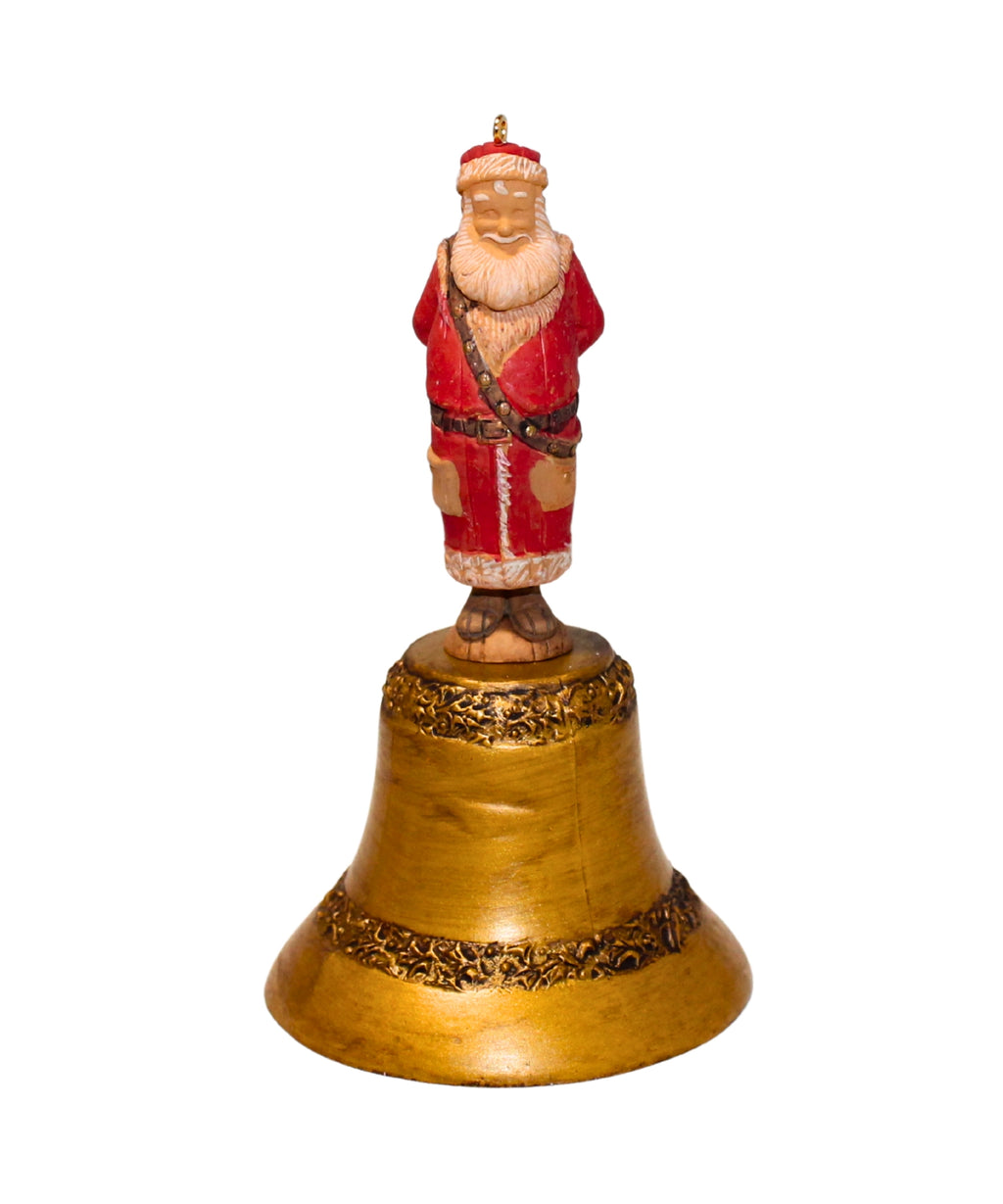 This ornament features Santa in his red suit standing on top of a Christmas bell. This battery operated ornament plays "Carol of the Bells".