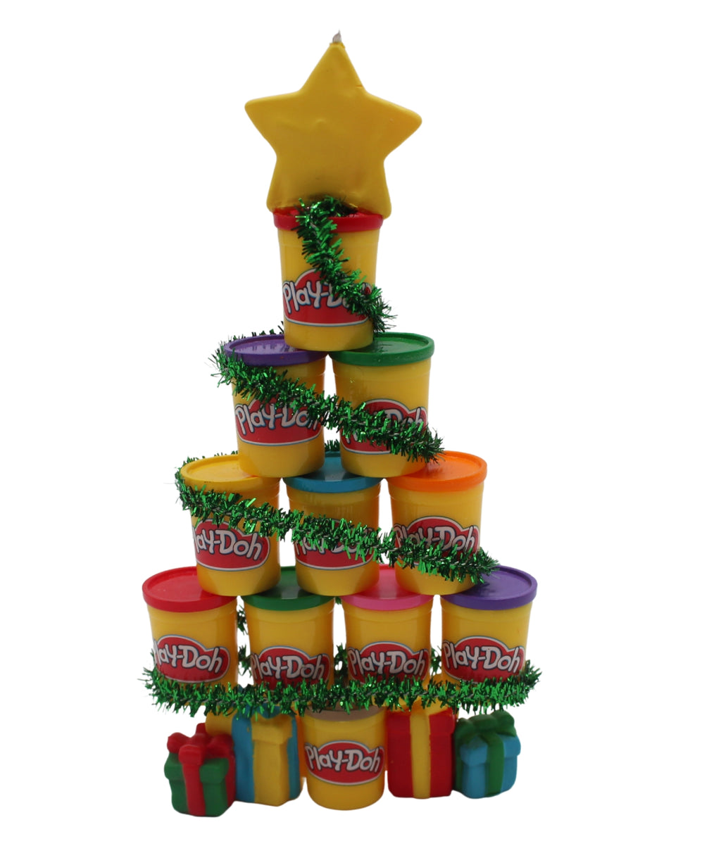 This ornament brings back lots of childhood memories of all the things you could make using a little bit of imagination and a jar of Play-doh. The ornament is a Christmas tree made using jars of Play-Doh wrapped with green tinsel and an added yellow star on top. All of the best colors of Play-doh are here from purple, green, red, and yellow to pink and orange.