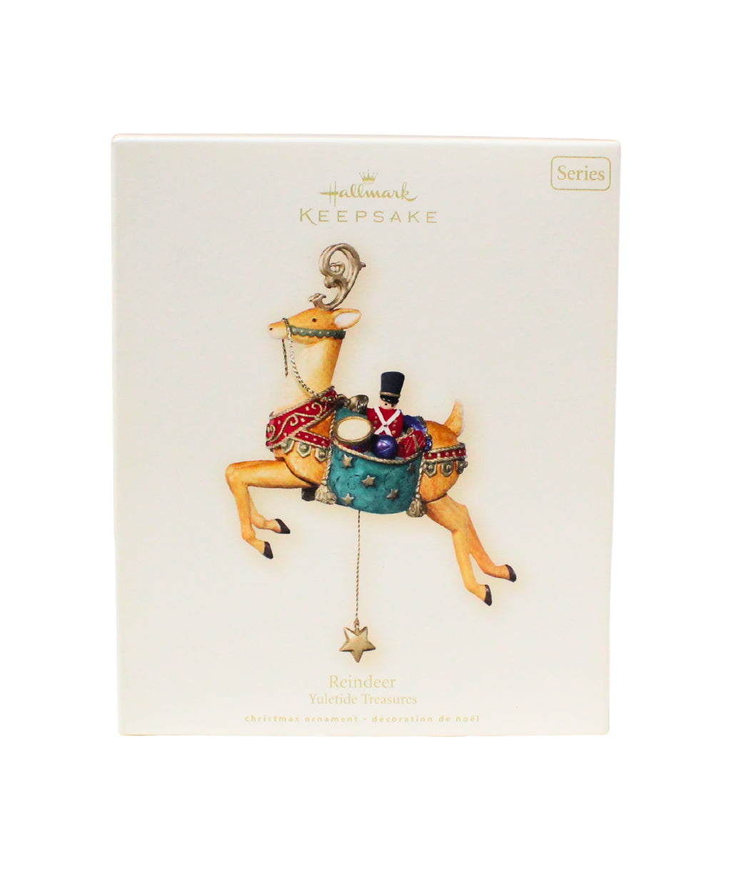 This ornament is the second in the Yuletide Treasures series and features a reindeer in a green saddle with gold trim, if you gently pull on the string with the golden star the legs on the reindeer move and the toy soldier goes down.