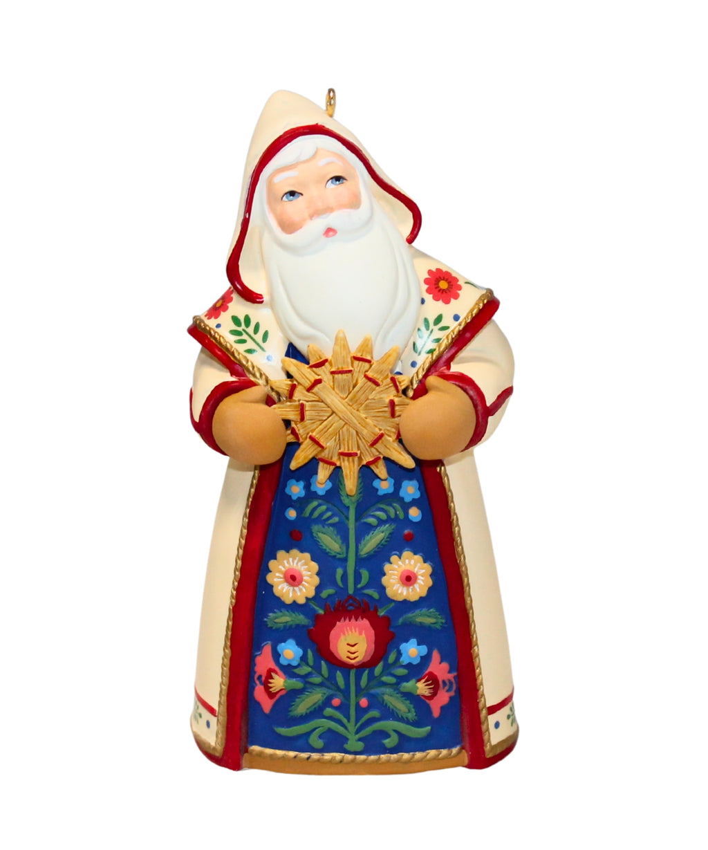 This ornament features Santa in a brightly colored red, white and blue robe decorated with flowers, he holds a Christmas star made out of straw.