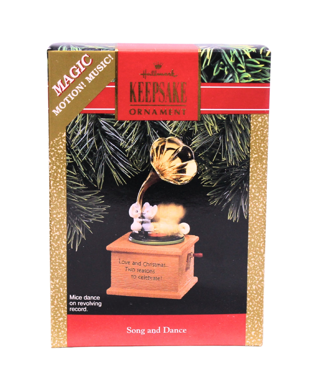 This motion and music ornament two mice on top of a record player that plays "Jingle Bells" and rotates when the crank is turned, plugs into the light bulb sockets on a miniature tree light string.