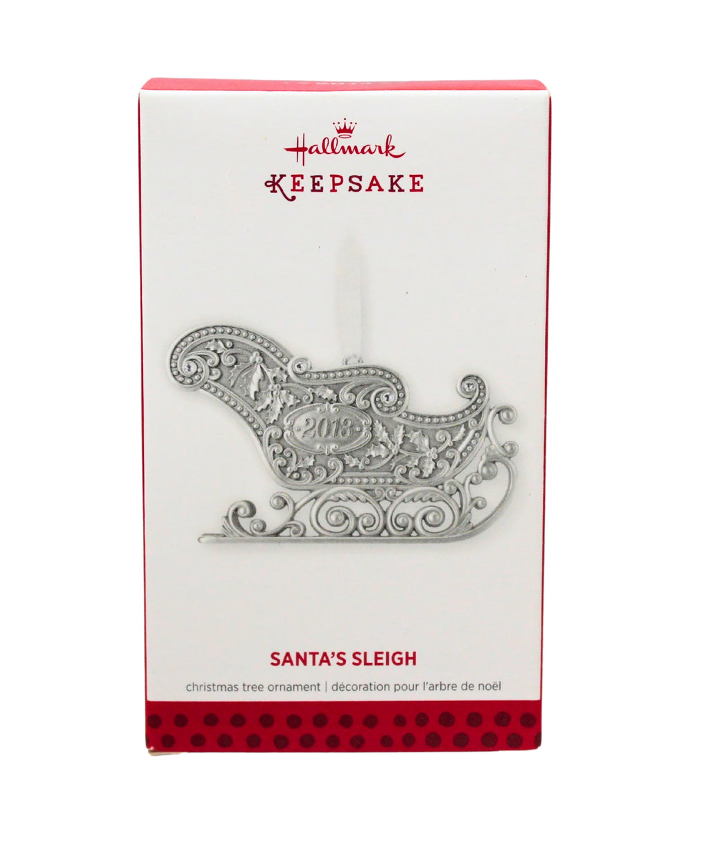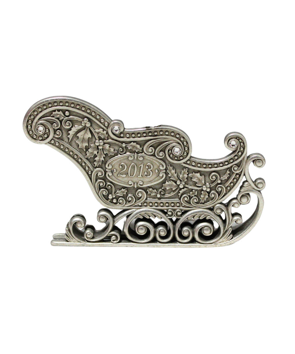 This decorative silver sleigh reads "2013", is crafted from metal and embellished with sparkling rhinestones.