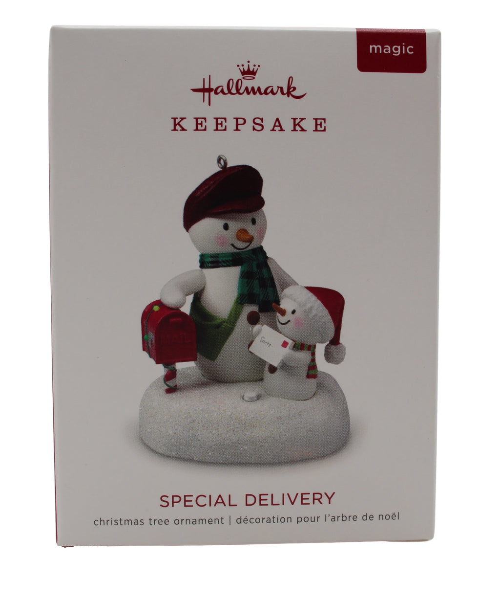 This ornament shows a post man snowman bringing a special delivery to a little snow person with a red cap. The two snowmen stand beside a bright cheery red mailbox with a candy cane striped pole and the Keepsake ornament plays music from "Up on the Housetop".